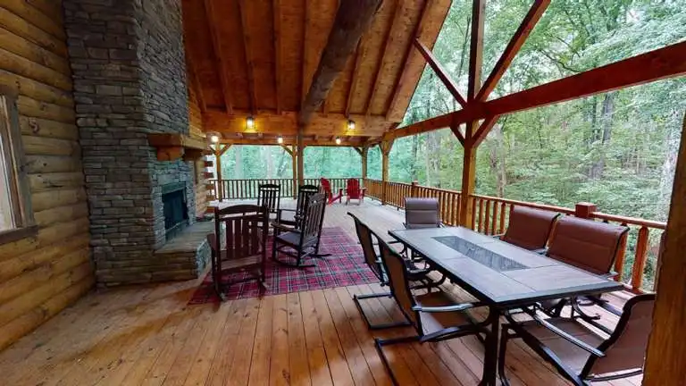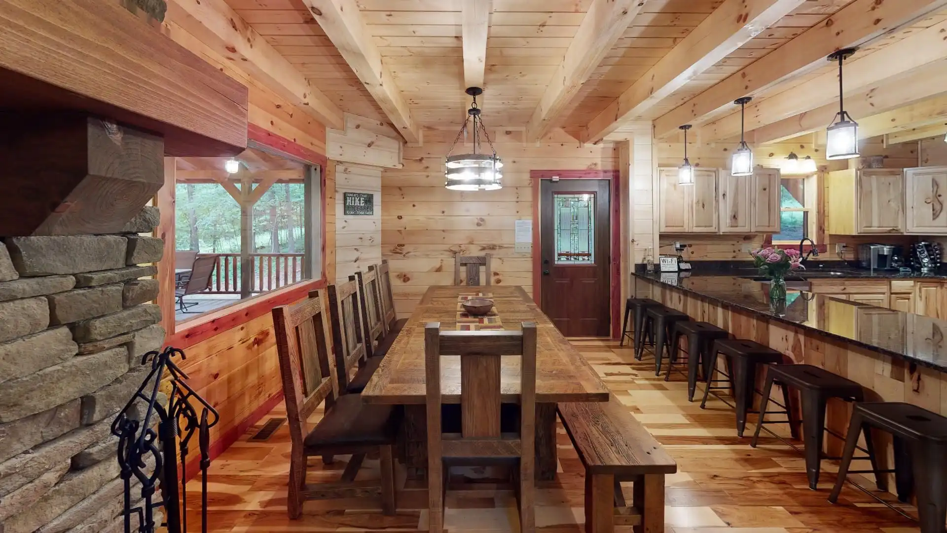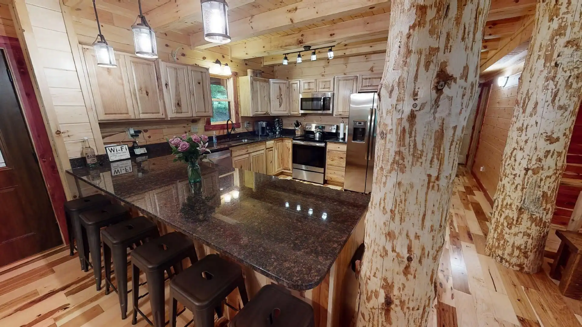 The floor plan is very open with multi-leveled extended decking that wraps around the entire lodge for an additional 2000 square feet under roof. We boast a fully-equipped kitchen for the chef of the group with an electric range and oven, a full sized refrigerator/freezer combo, dishwasher, and propane grill just outside the kitchen door on the covered back deck.
