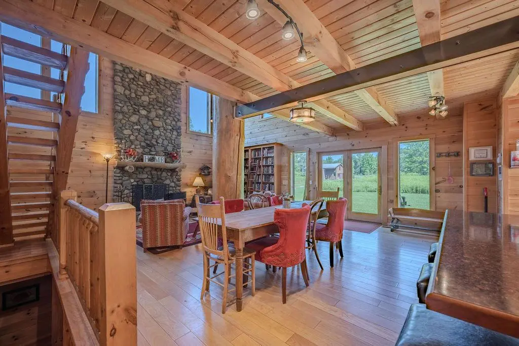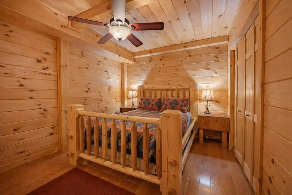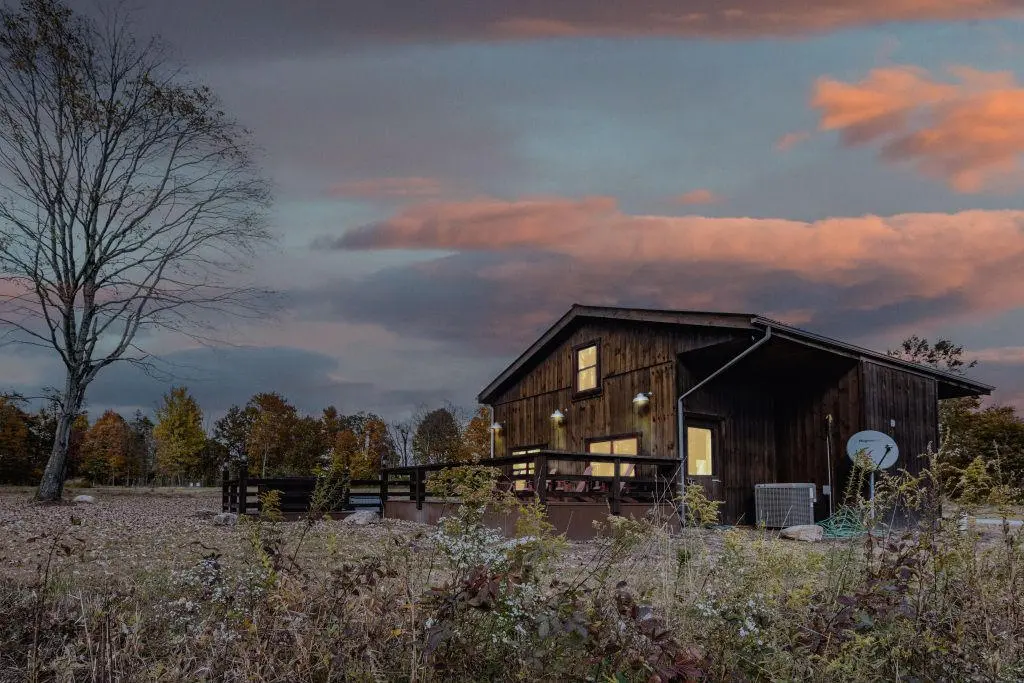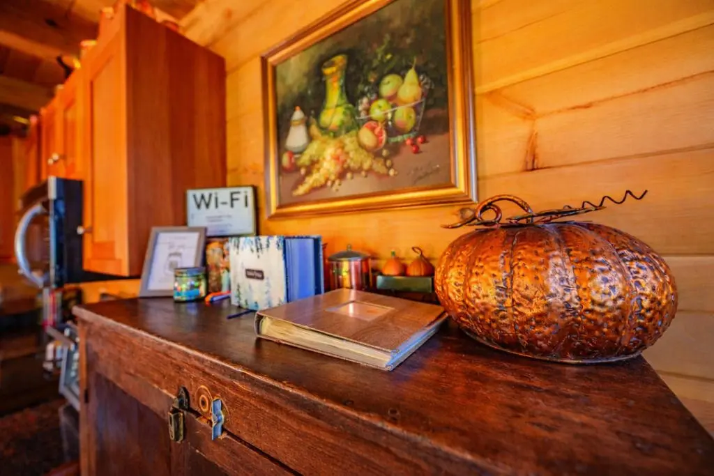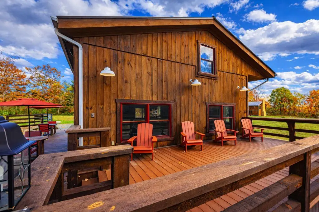 The first guest structure: The Barn at Pumpkin Ridge was built with locally-sourced soft and hard-woods. It features towering oak tree postings and an original artist-created elk chandelier as centerpieces of the indoor living experience. Additionally, The Barn has two vaulted indoor wood-burning fireplaces (main level and lower level) made of local river rock, hand crafted, oak log queen-sized beds, a full-service gourmet kitchen, an outdoor bar, grilling deck, wildlife observation deck, hot tub, and primitive fire ring. We offer two queen beds with private sitting areas and 2.5 bathrooms to meet the needs of our most discerning guests.