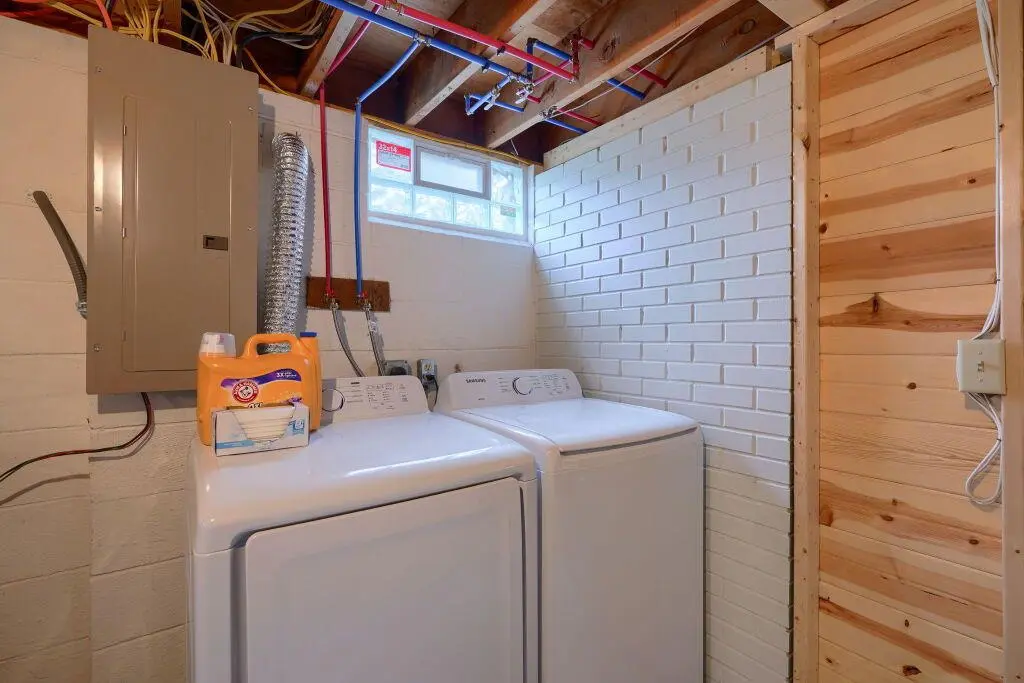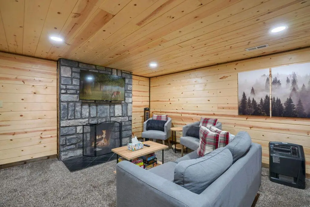 In the basement you'll find a lower level seating and entertainment area with gas log fireplace and a separate bedroom with 2 twin beds. A toilet and sink are next to the bedroom and a separate shower can be found through the arcade area. Access to washer/dryer is on the lower level.