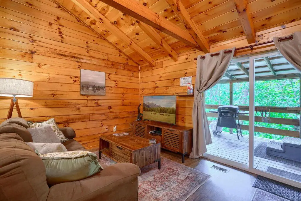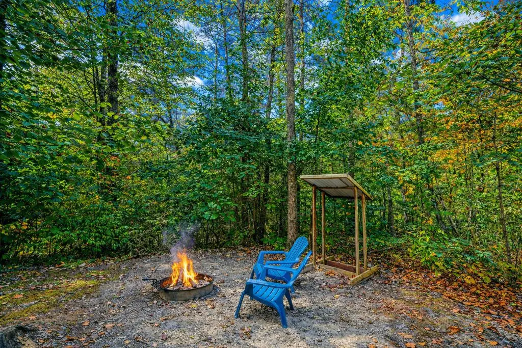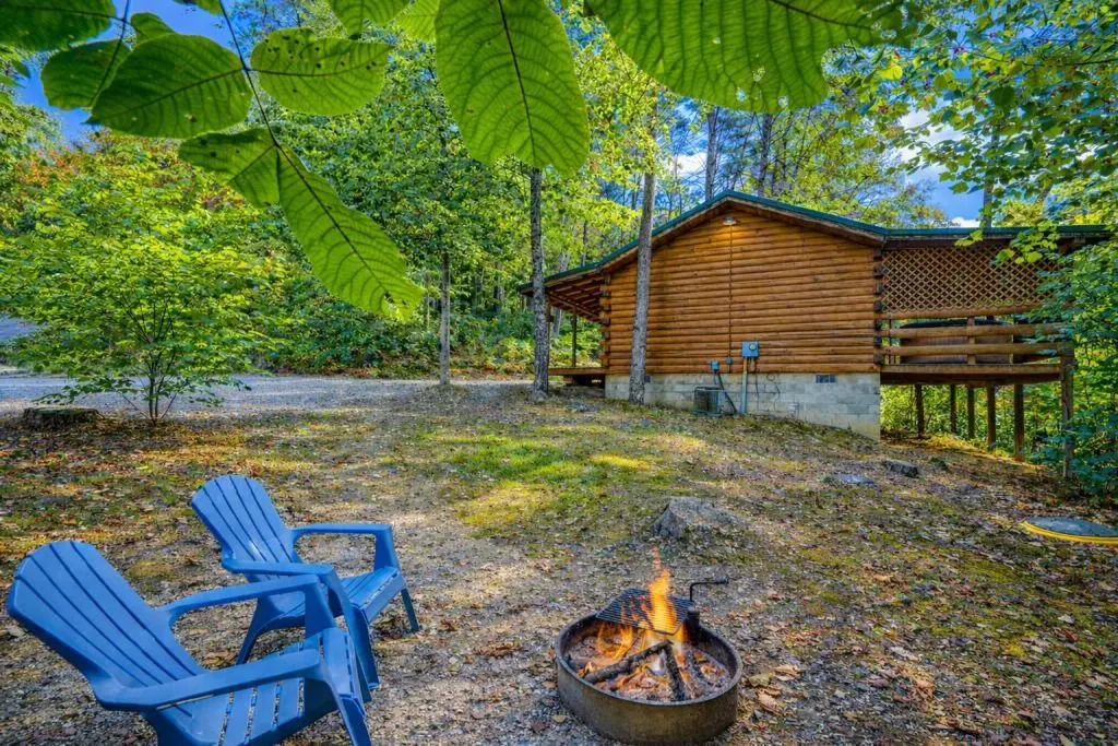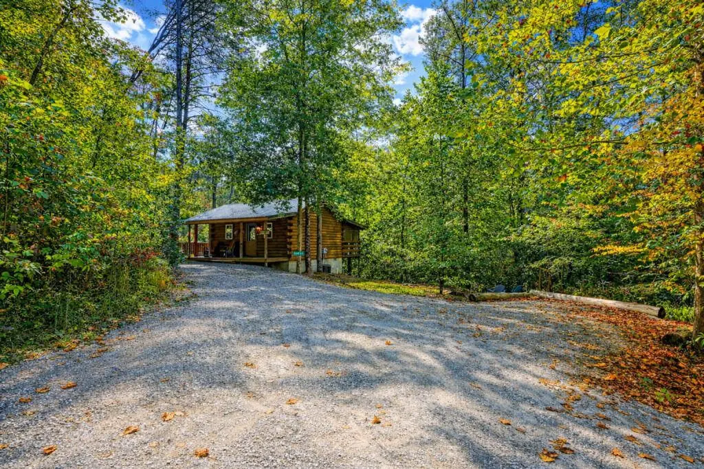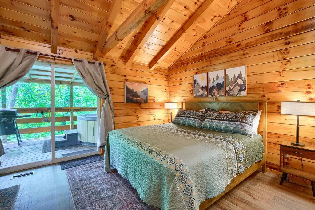A secluded, single room cabin that offers a king-sized bed, hot tub, gas grill, fire pit, and all you need for a quiet little getaway.